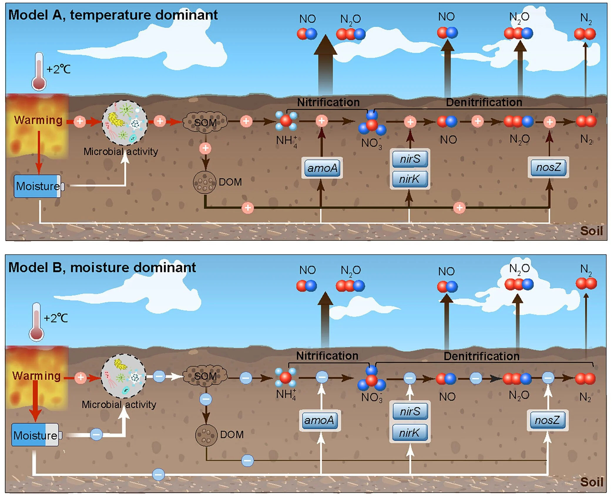 New long-term field measurements from the Qingyuan Forest Warming Experiment—the world’s largest infrared forest-warming platform—show that a 2 °C temperature increase reduces gaseous nitrogen losses from temperate forest soils. Using more than 200,000 automated measurements collected over six years, researchers found that warming decreased nitric oxide (NO) emissions by 19% and nitrous oxide (N₂O) emissions by 16%, contradicting long-held expectations based on laboratory-derived temperature sensitivities. The study shows that even modest warming-induced soil drying can suppress the microbial processes that generate these gases, offering new insight into how nutrient cycling responds to climate change. By revealing that field-based nitrogen responses differ substantially from model assumptions, this work underscores the essential role of long-term, high-resolution ecosystem observations in improving climate and biogeochemical models.
