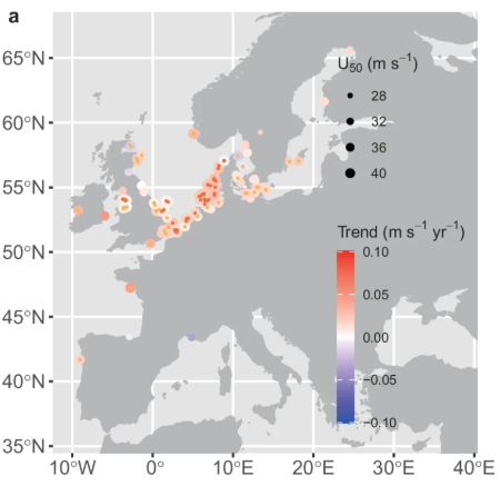 Using more than eight decades of hourly wind data, Zhao et al. show that extreme ocean winds relevant for turbine design have strengthened across much of the world’s coasts. The 50-year return wind speed (U₅₀) increased on average by 0.016 m s⁻¹ per year and rising in nearly two-thirds of coastal regions. The study finds that over 40% of existing and planned offshore wind farms in Asia and Europe have already experienced wind speeds above the design threshold for Class III turbines. Many of these projects are located where U₅₀ is still increasing due to changes in tropical and extratropical cyclone activity. Rather than arguing against offshore wind, the authors emphasize that these long-term wind and sea-surface temperature records are essential for strengthening its resilience: they highlight the need for higher design-load classes, region-specific engineering standards, and resilience-focused planning that account for evolving extremes over a turbine’s lifetime. This work underscores how sustained, high-quality atmospheric and ocean observations provide the foundation for safe, durable offshore wind expansion in a warming, windier world.